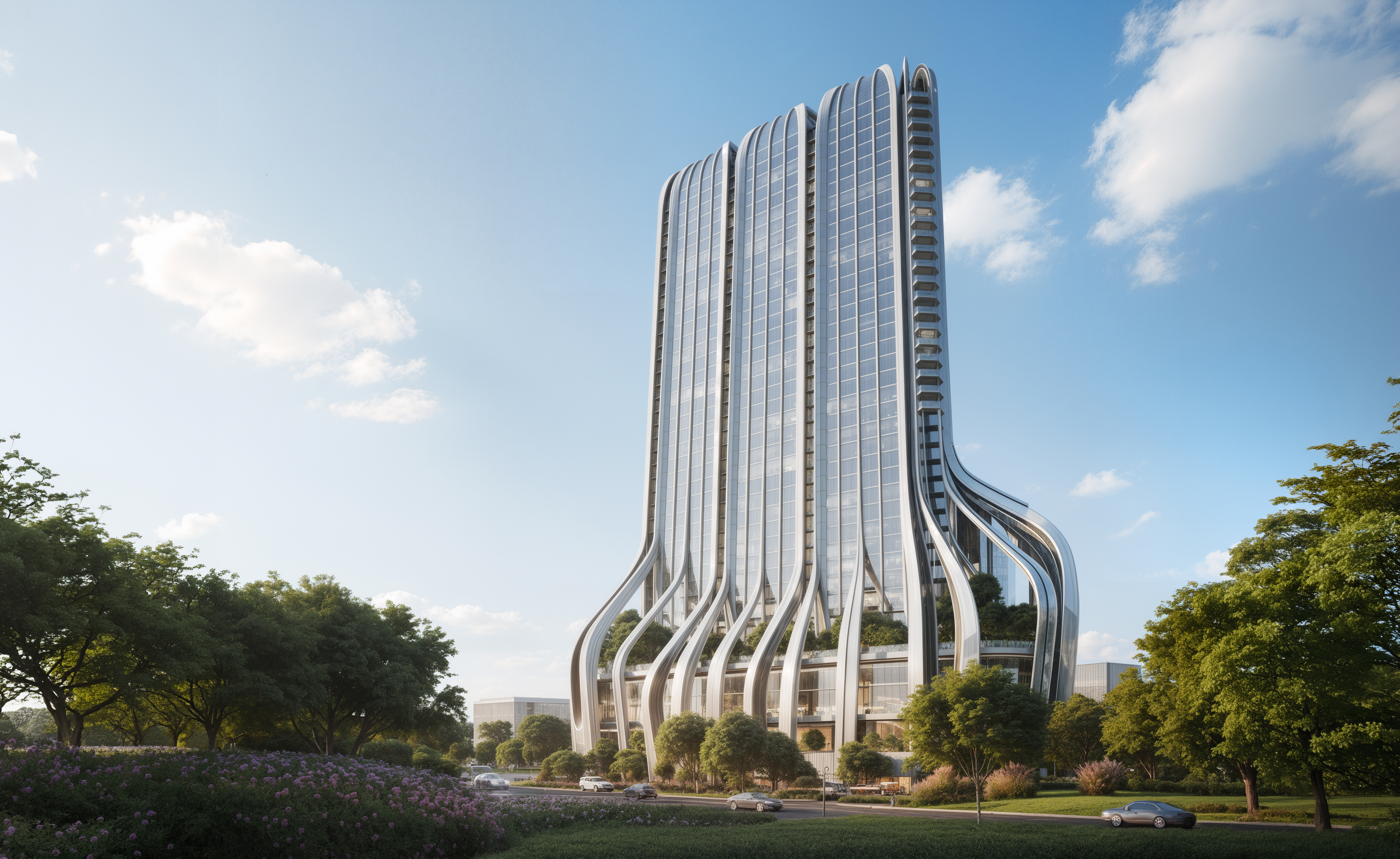 The design was conceived as an array of verticals that would peel off the tower and create an implied envelope. The clean form of the tower would give way to the variation in program at the base but create a cohesive vision of a smooth form. The heavy bulk of the tower was divided into the appearance of 3 joined towers to accentuate a slenderness that was otherwise missing from the overall bulk.